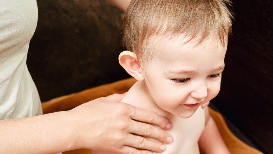 Ręce kładziemy na barkach dziecka, by kciuki znajdowały się na jego barkach lub obojczykach. Kciuk powinien robić ruch cofania barku.