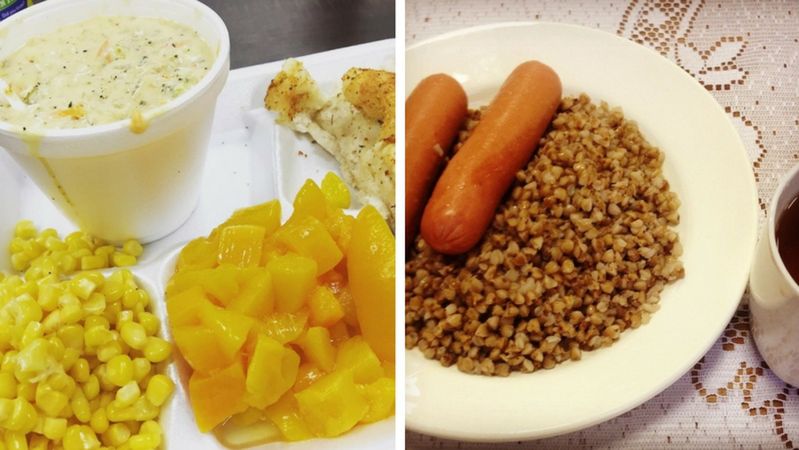 W Rosji uczniowie mogą otrzymać darmowe śniadanie od godz 9.00 do 12.00. Po godzinie 12.00 za serwowany obiad trzeba zapłacić. Często nie jest jednak jasne, który posiłek jest śniadaniem, a który już obiadem jeśli chodzi o jego składniki. Przykładem jest danie z powyższego zdjęcia. Widzimy na nim kiełbaski, dużą porcję kaszy gryczanej oraz herbatę.