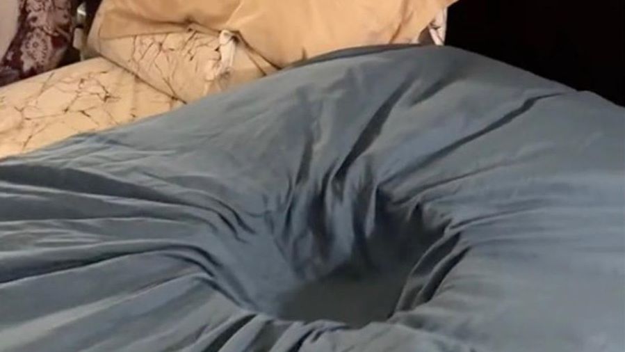 Następnie mężczyzna podchodzi do materaca żony i bardziej szczegółowo pokazuje, jak wygląda jego "przełomowy wynalazek". Jak się okazuje, Tony po prostu wyciął w nim dziurę na ciążowy brzuszek żony.