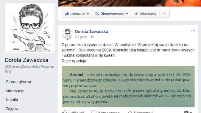 Dorota Zawadzka, psycholog znana z programu "Super Niania", wrzuciła na swój profil na Facebooku zdjęcie fragmentu z poradnika dla przyszłych mam. Czytamy w nim, że kobiety w ciąży mogą pozwolić sobie na jedno piwo, byle nie częściej niż raz w tygodniu. Zawadzka skrytykowała takie zachowanie, ale, o dziwo, wyśmiały ją niektóre matki.